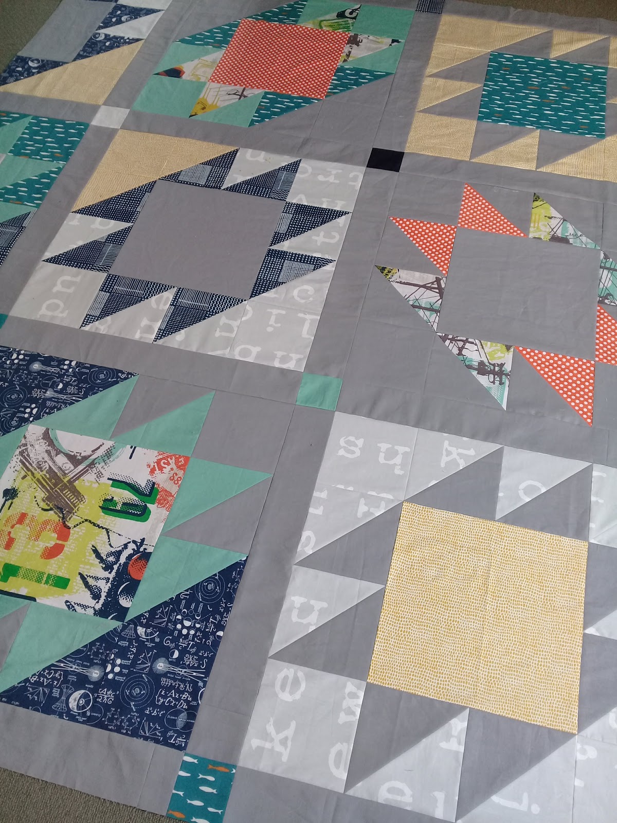 And it all coming together. In the end I treated the orange print, the feature graphic print and the fish print as one fabric grouping - "the accent pops". The other categories were the light greys, the aqua solid, the navy's, the yellow print and the mid grey solid for the background. Full disclosure, I did need to piece off cuts of the fat quarters used to make some of the units.